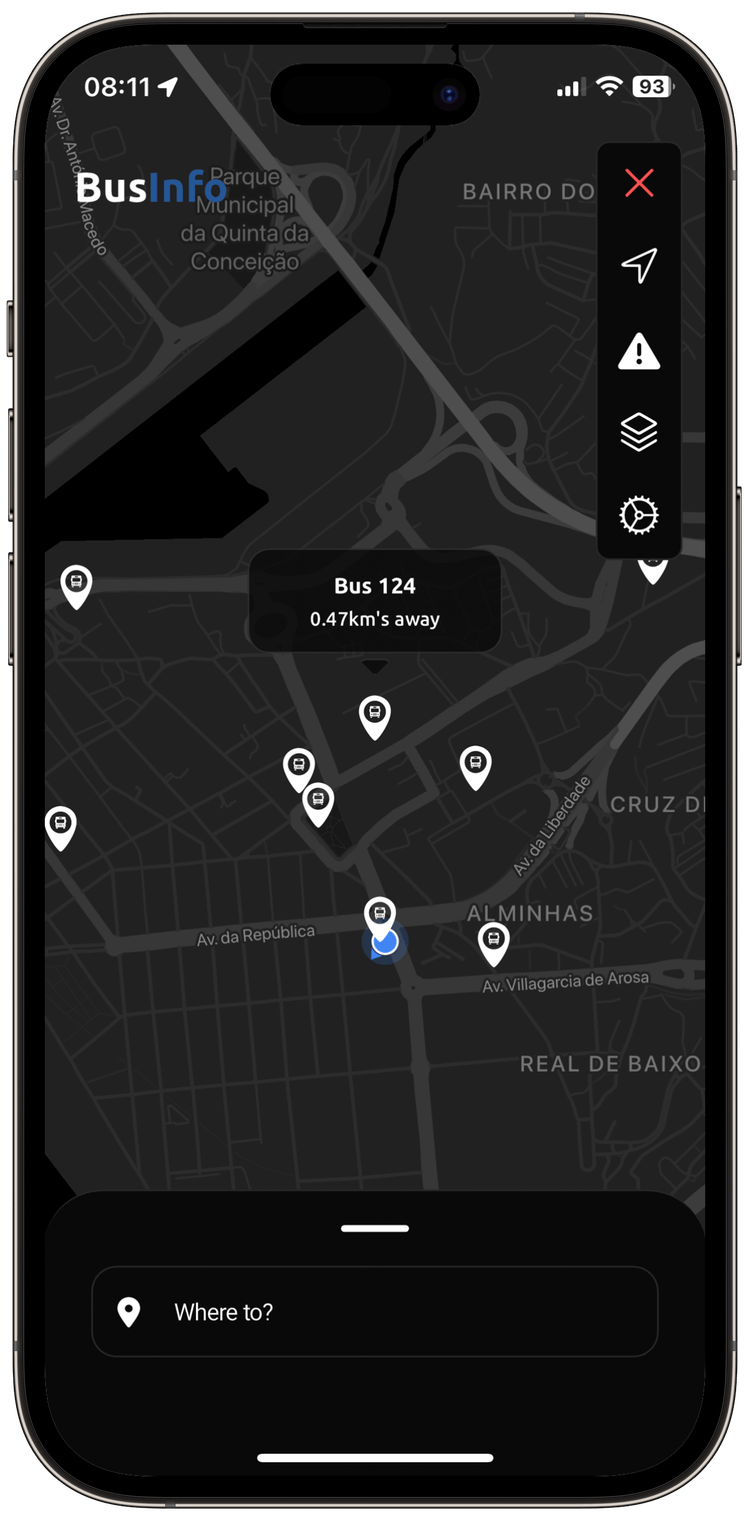 O BusInfo fornece atualizações seguras e fáceis em tempo real sobre as localizações e chegadas dos autocarros, garantindo uma experiência do utilizador sem problemas.